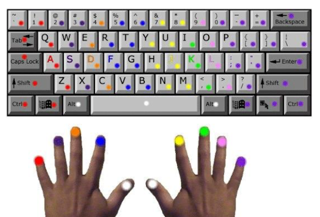 Penempatan posisi jari yang benar pada keyboard, sangat berperan besar terhadap interaksi kita dengan komputer. Keyboard komputer terbagi menjadi 2 kolom, yaitu kolom bagian tangan kanan dan bagian tangan kiri. Jadi antara tangan kanan dan tangan kiri memiliki hak akses tombol yang berbeda. Pembagian tersebut dapat dilihat pada gambar di bawah ini :